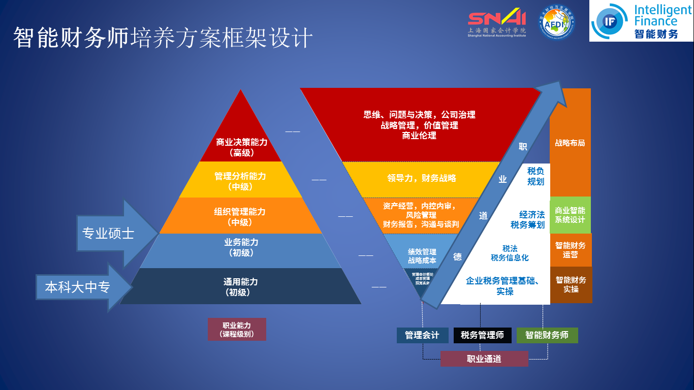 立足实务,放眼未来。课程综合了产业、学术、研究三大领域的前沿知识和实用技能,总结和归纳当今企业在技术发展与管理变革方面的最新经验,由易到难、逐步升级。充分考虑了智能财务管理发展的阶段和对财务人员胜任能力的要求。致力于培养财务会计领域第一批智能财务师,使之逐步成长为集战略洞察力,财务管理力,信息沟通力和业务管控力于一体的高级智能财务人才。